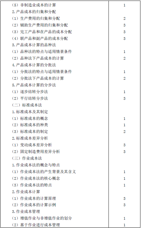 5. 成本计算,包括产品成本计算、标准成本法和作业成本法;