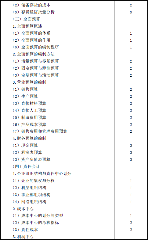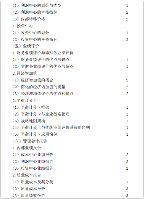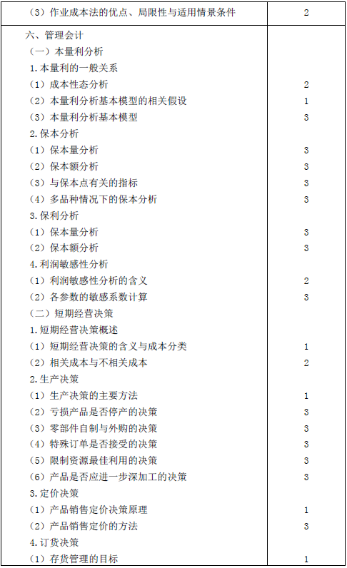 6 . 管理会计,包括本量利分析、短期经营决策、全面预算、责任会计、业绩评价和管理会计报告。