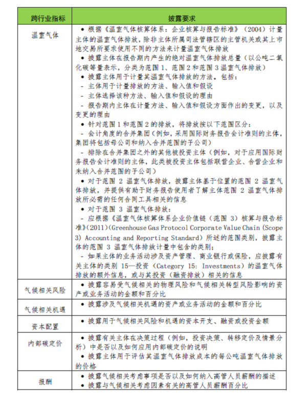 在气候相关指标方面,IFRS S2要求披露跨行业类别相关的信息,旨在表明气候相关风险和机遇的关键方面和驱动因素,并提供关于气候变化对主体潜在财务影响方面的见解。具体而言,IFRS S2要求披露根据《温室气体核算体系:企业核算与报告标准》(2004年)(Greenhouse Gas Protocol: A Corporate Accounting and Reporting Standard)计量的范围1、范围2和范围3的温室气体排放核算与报告等信息,除非主体所在司法管辖区或上市地交易所要求使用不同的方法计量温室气体排放,并在此基础上提出了一系列具体披露要求。下表汇总了气候变化相关的指标以及披露要求。
