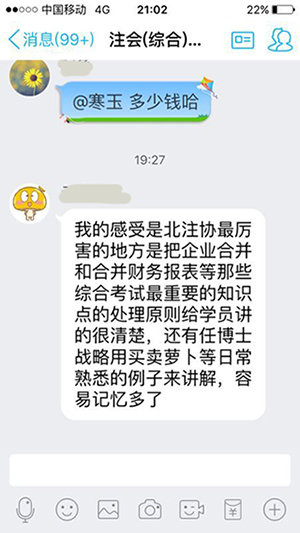 “我的感受是北注协最厉害的地方是企业合并和合并财务报表等那些综合考试最重要的知识点的处理原则给学员讲的很清楚,还有任博士战略用买卖萝卜等日常熟悉的例子来讲解,容易记忆多了。”