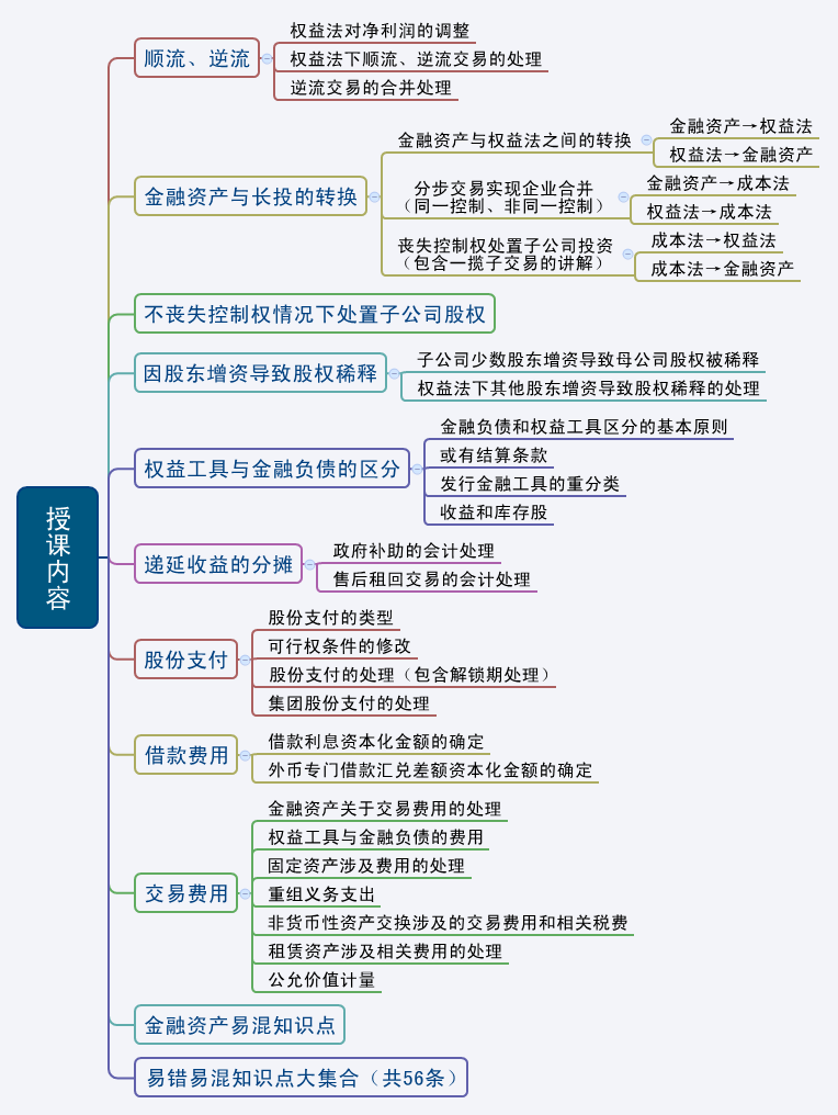 听了《会计》易错易混专题班,真真的是学到了,讲义上竟是精华的内容,尤其讲义最后老师归纳总结的56个易错易混知识点集合,大多都是平时学习中会忽略的一些细节,虽然短短的6个小时,却学到了很多,尤其老师黑板上画的那个图,从金融资产到权益法再到成本法的6种情况下处理,太形象了,还有工程结算和工程施工比较大小什么情况列示为资产,什么情况下列示为负债,通过老师讲解一下子就明白了,总之就是学到了很多之前在学习中忽略的知识,感谢这个班,感谢老师。